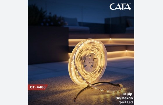 CT-4488 10 CIP SERIT LED DIS MEKAN GUNISIGI DAYANIKLI AYDINLATMA, sicak ve yumusak tonlu dis mekan dekoratif aydinlatmalar icin tasarlanmis kaliteli bir serit LED modelidir. 10 cipli guclu yapi ve dis mekan uyumlu govde ile cephe, tabela, bahce, vitrin dis kenari ve etkinlik alanlarinda etkili sonuc verir. Gunisigi tonu sayesinde ortama daha samimi bir hava kazandirir.