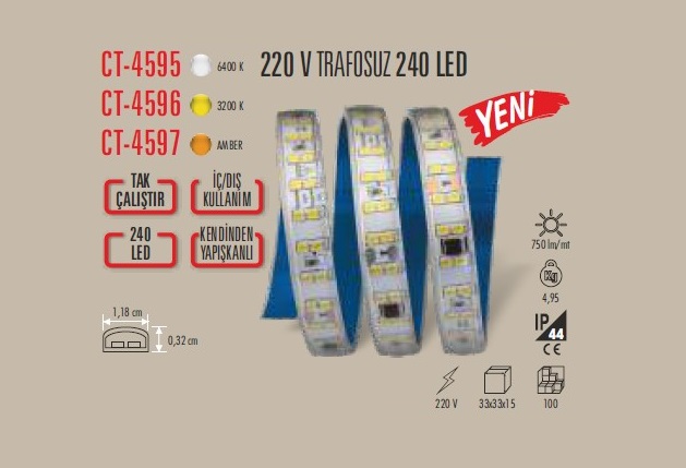 CT-4497 220V 120 LED AMBER YAPISKANLI SERIT LED AYDINLATMA modeli, amber renkli sicak isik tonu, yuksek LED yogunlugu, yapiskanli kolay montaj yapisi ve 220V pratik kullanim ozelligi ile dekoratif ve ticari aydinlatmalarda kaliteli bir cozum sunar.