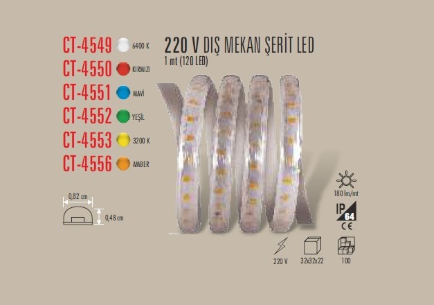 CT-4556 220V Dis Mekan Serit LED Amber Dayanikli Dekoratif Aydinlatma modeli, sicak amber tonu ile dekoratif ve dikkat cekici aydinlatma ihtiyaclarinda kullanilmak uzere tasarlanmis kaliteli bir serit LED urunudur. 220V dogrudan calisma ozelligi sayesinde pratik montaj imkani sunar ve uzun metrajli uygulamalarda kolaylik saglar. Amber renk tonu; vitrin, tabela, bahce, cephe ve etkinlik dekorasyonlarinda estetik ve premium bir gorunum olusturur.