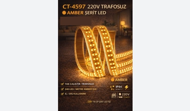 CT-4597 220V 240 LED AMBER YAPISKANLI SERIT LED DEKORATIF AYDINLATMA amber tonlu dikkat cekici isik isteyen uygulamalar icin ideal serit led cozumudur.