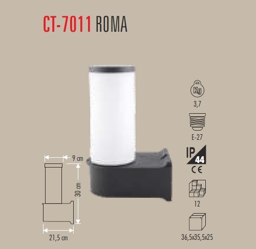 CT-7011 ROMA BAHCE ARMATURU APLIK E27 DUVAR TIPI DIS MEKAN, dekoratif duvar tipi tasarimi, E27 ampul uyumu ve dis mekan dayanikliligi ile bahce ve cephe aydinlatmalarinda sik bir tercihtir.