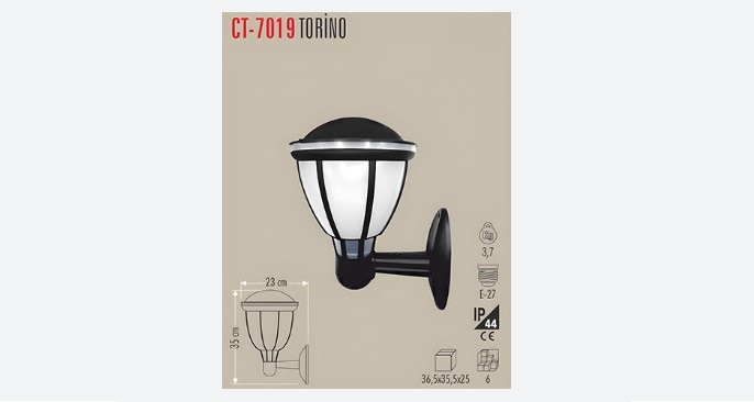 CT-7019 TORINO BAHCE ARMATURU APLIK E27 DUVAR AYDINLATMA, duvar tipi dekoratif formu, E27 ampul uyumu ve dis mekan dayanikliligi ile bahce ve bina cephelerinde kaliteli aydinlatma saglar.