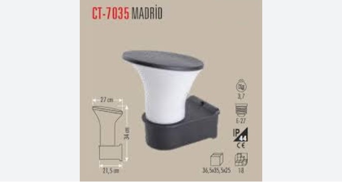 CT-7035 Madrid Bahce Armaturu Aplik E27 Duvar Tipi modeli, bahce duvarlari, giris alanlari, veranda ve dis cephelerde dekoratif ve kullanisli bir duvar aydinlatmasi saglamak icin gelistirilmis sik bir aplik modelidir. E27 ampul uyumu sayesinde farkli guc ve renk tonlarindaki ampuller ile birlikte kullanilabilir. Madrid serisinin zarif detaylari ile cephelere estetik bir dokunus kazandirir.
