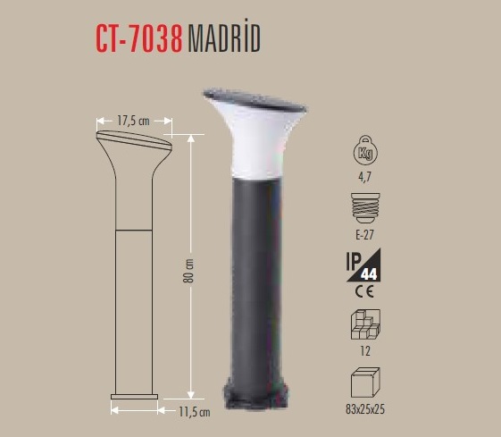 CT-7038 Madrid Bahce Armaturu 80 CM E27 Uzun Direk modeli, genis bahce alanlari, yuruyus yollari ve villa cevrelerinde daha belirgin dekoratif aydinlatma etkisi saglamak icin gelistirilmis uzun boylu bir dis mekan armaturudur. E27 ampul uyumlulugu sayesinde farkli isik guclerine ve renk tonlarina gore kolayca uyarlanabilir.
