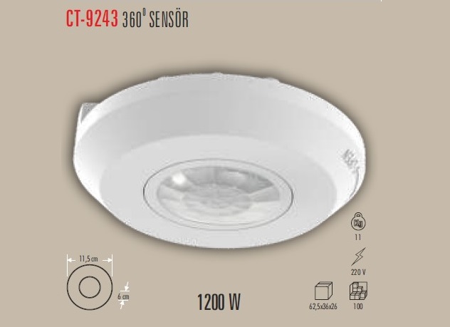 CT-9243 360 DERECE HAREKET SENSORU 1200W GENIS ALGILAMA MODEL genis kapsama alani ve otomatik kontrol ozelligi ile etkili sensor cozumudur.