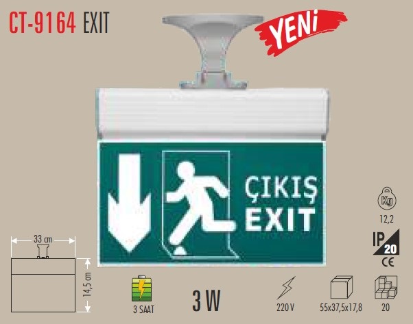CT-9164 3W EXIT CIKIS ARMATURU LEDLI 3 SAAT AKULU ACIL CIKIS LEVHASI acil tahliye alanlari icin yuksek gorunurluk sunan guvenilir exit armaturudur.