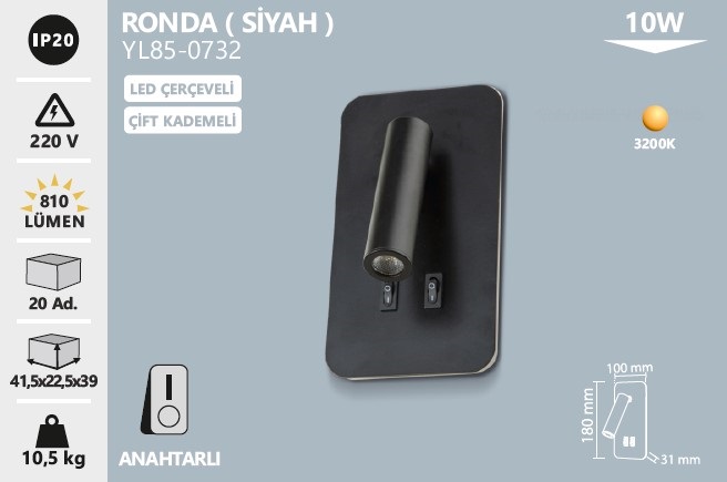 YL85-0732 NOAS LED 3+7W SIYAH KASA GUN ISIGI RONDA APLIK modeli, modern dekoratif duvar aydinlatmasi ihtiyaci icin tasarlanmis, cift guclu aydinlatma yapisi ve estetik siyah kasa gorunumu ile one cikan sik bir NOAS aplik cozumudur. 3+7W guc kombinasyonu sayesinde hem dekoratif etki hem de daha belirgin isik performansi sunar. Gun isigi tonu ile mekanlarda dogal, dengeli ve konforlu bir aydinlatma karakteri olusturur.