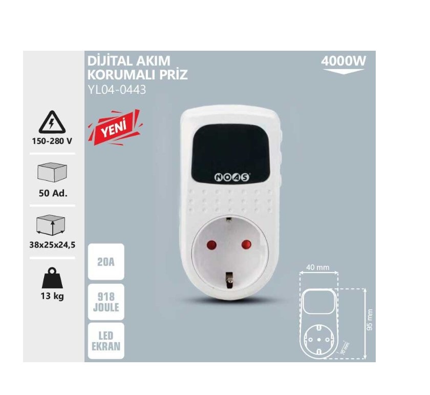 YL04-0443 NOAS LED DIJITAL AKIM KORUMALI PRIZ 4000W ELEKTRONIK URUN, dijital kontrol avantajı ve akim koruma ozelligi ile elektronik cihazlar icin guvenli bir priz cozumudur. 4000W kapasitesi sayesinde televizyon, bilgisayar, modem, beyaz esya ve farkli elektronik urunlerde ev, ofis ve teknik alan kullanimi icin ideal koruma saglar.