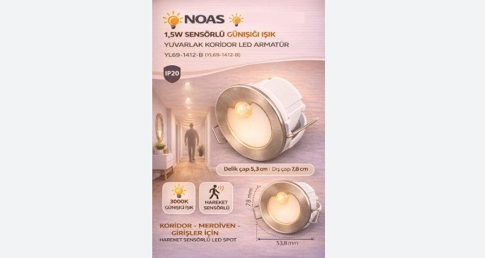 YL69-1412-B NOAS LED 1.5W SENSORLU KORIDOR ARMATUR YUVARLAK GUN ISIGI modeli, koridor ve gecis alanlarinda daha yumusak ve dengeli bir aydinlatma isteyen kullanicilar icin tasarlanmis kaliteli bir sensorlu LED armaturdur. 1.5W gucu ile ekonomik bir kullanim sunarken hareket algilama ozelligi sayesinde yalnizca ihtiyac aninda devreye girer. Gun isigi tonu, ortama daha dogal ve konforlu bir aydinlatma karakteri kazandirir.