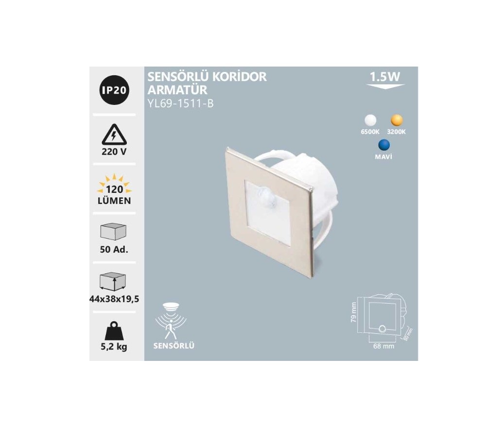 Kare tasarim, daha keskin ve modern bir aydinlatma dili tercih edilen mekanlarda estetik bir avantaj sunar. Apartman koridoru, bina girisi, otel katlari, merdiven boslugu ve gece yonlendirme bolgelerinde rahatlikla kullanilabilir. Sensor ozelligi sayesinde karanlik alanlarda guvenli gecis hissini artirir ve manuel anahtar ihtiyacini azaltir.