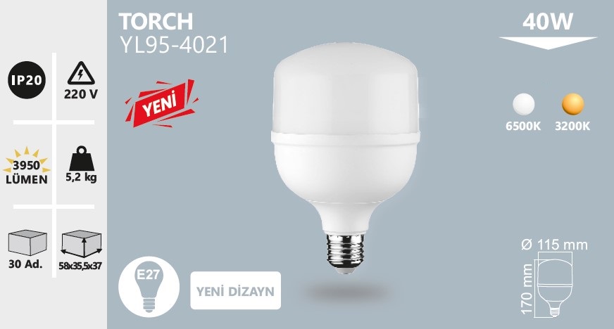NOAS YL95-4022 40W Led Torch Ampul Gun Isigi, yuksek aydinlatma gucu, dengeli gun isigi tonu ve tasarruflu LED yapisi ile genis alanlar icin ideal bir torch ampuldur.