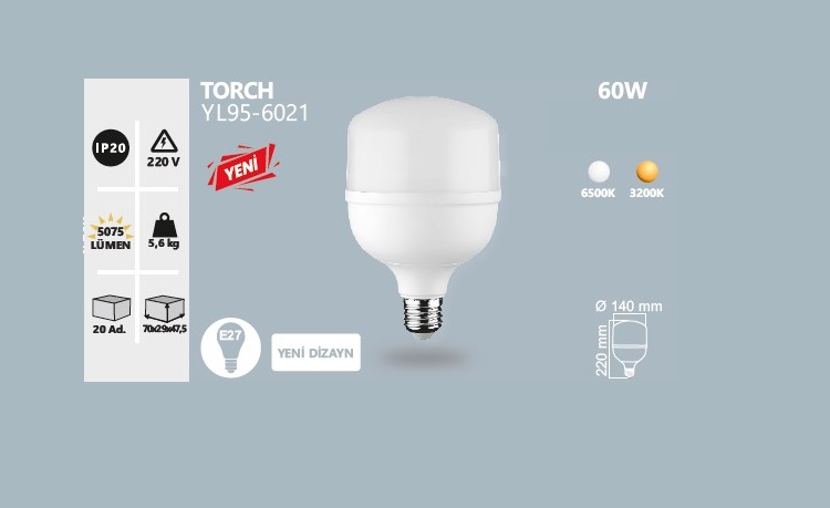 NOAS YL95-6022 60W Led Torch Ampul Gun Isigi, cok yuksek aydinlatma gucu, dengeli gun isigi tonu ve verimli LED yapisi ile genis alanlar icin ideal secenektir.