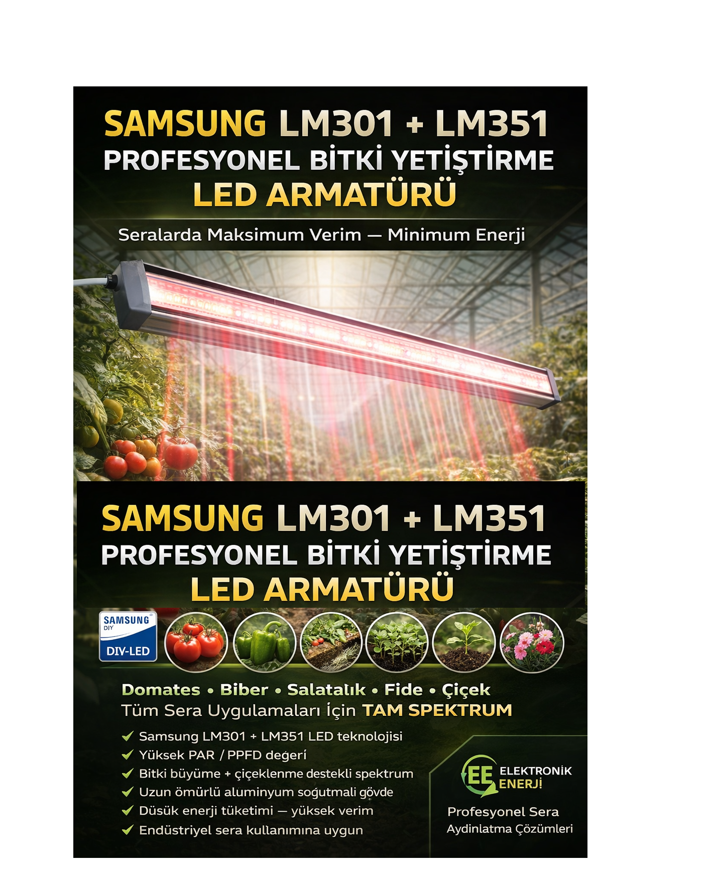 Full spektrum yapısı sayesinde sebzeler, meyveler, süs bitkileri, tıbbi aromatik bitkiler ve çiçekler için uygundur. Kapalı ortamlarda güneş ışığının yerini alabilecek şekilde optimize edilmiştir.